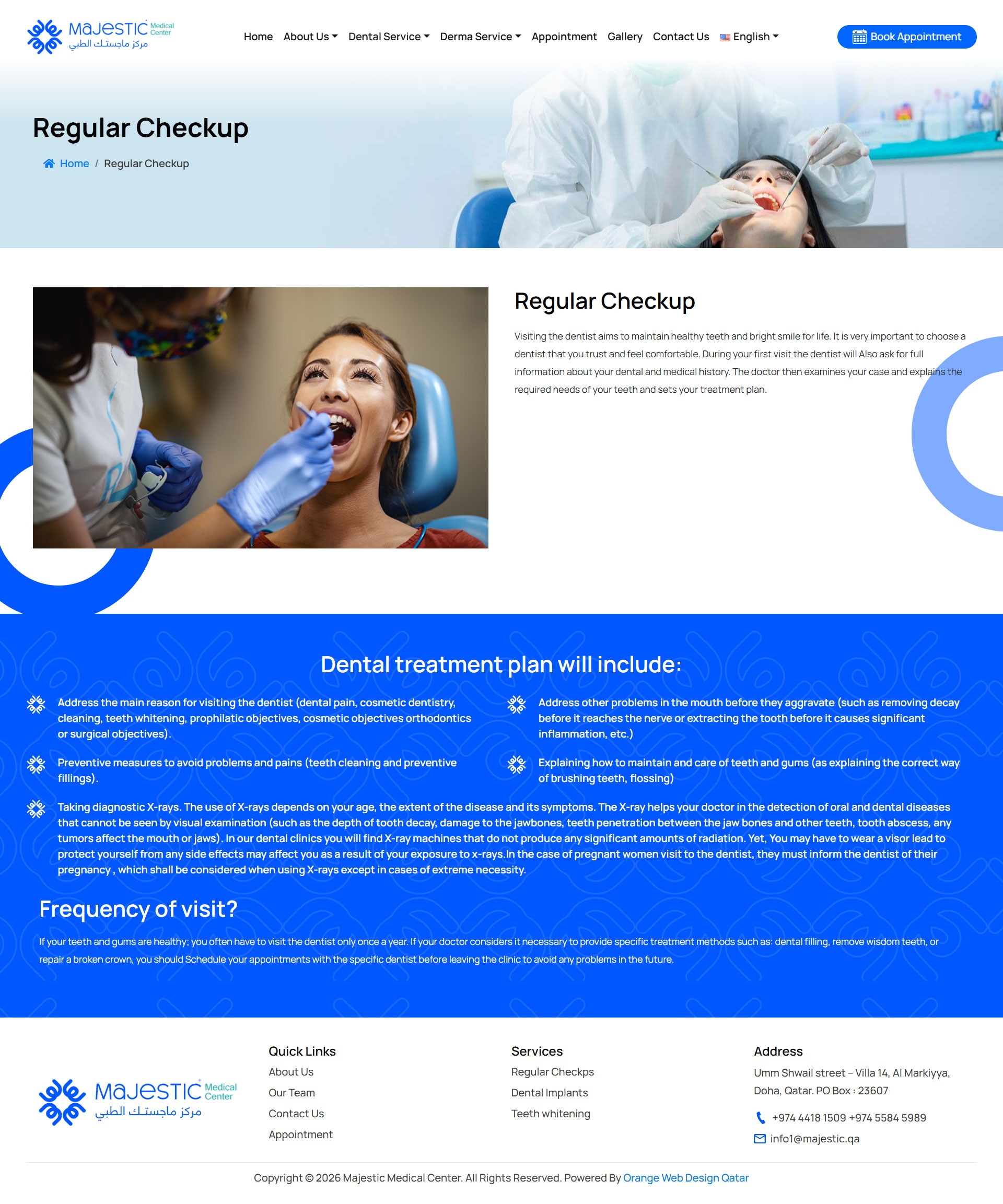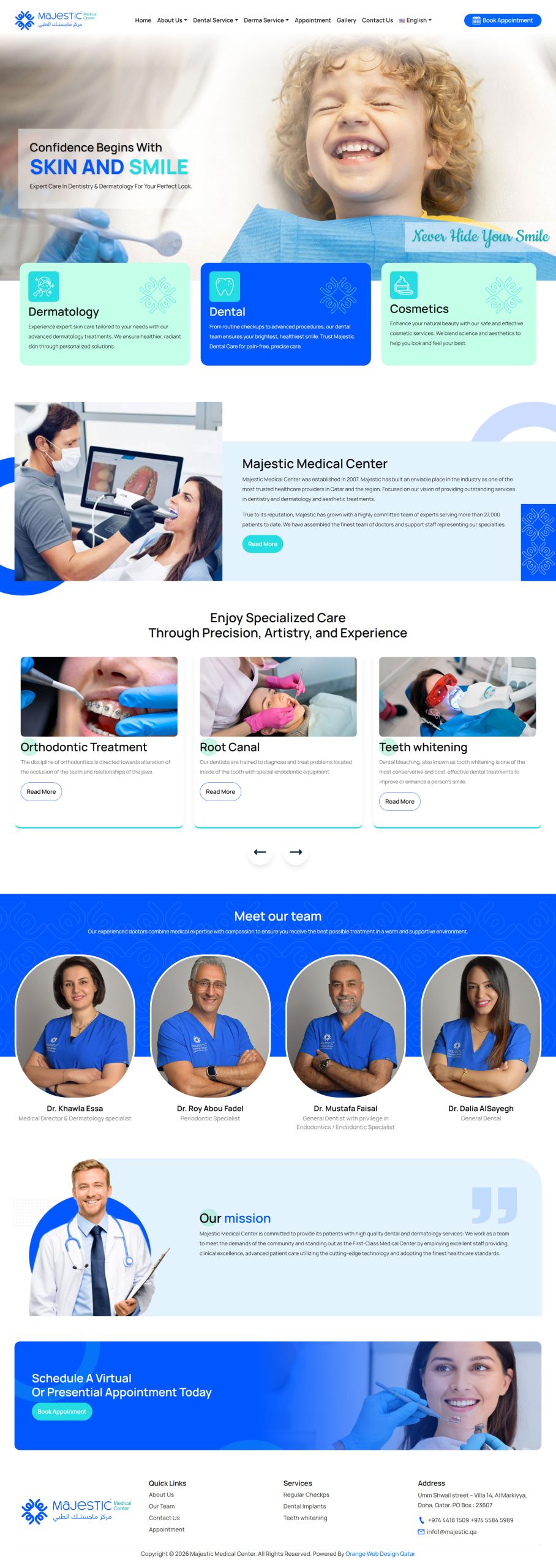 Majestic Medical Center is a premier healthcare provider in Doha, Qatar, offering specialized services in dentistry, dermatology, and cosmetic treatments. The primary objective of this project was to revamp their digital presence to reflect their established reputation, improve usability, and create a seamless bilingual (English and Arabic) experience for both new and existing patients.